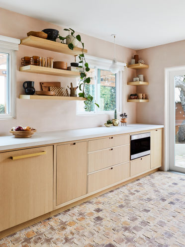 A Blush Spanish Inspired Modern Kitchen | The kitchen was opened up to the dining area by expanding the doorway to mimic the arch to the living room which in turn made the dining area feel more open and function better as the home's hub passthrough. Adding in natural materials through the terra cotta floor tiles, wood cabinetry, concrete counters, handmade tiles, & blush roman clay walls gave this kitchen a more modern yet overall down to earth feel.